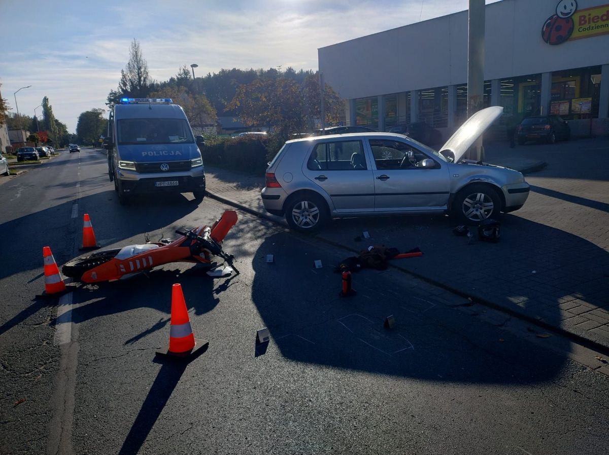 19-letni kierujący motocyklem KTM nie zdołał uniknąć zderzenia. Obrażenia jakie odniósł zakwalifikowały to zdarzenie jako wypadek.