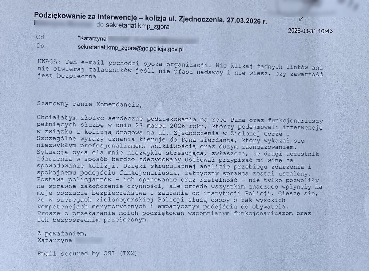 Zielonogórscy policjanci otrzymali bardzo miłą wiadomość od kobiety, która chciała w ten sposób podziękować za szybką reakcję na sytuację, w której uczestniczyła. Z przesłanego przez nią maila wynika, że funkcjonariusze wyjaśnili okoliczności kolizji, w której była pokrzywdzoną. Interwencja była niezbędna, gdyż sprawca zdecydowanie twierdził, że to pokrzywdzona zawiniła. Dzięki reakcji sierżant Agnieszki Kowalik i sierżanta Macieja Ogórka oraz wyjaśnieniu wszystkich okoliczności i ustaleniu, kto był winnym zderzenia pojazdów, kobieta uniknęła nieprzyjemnych konsekwencji.